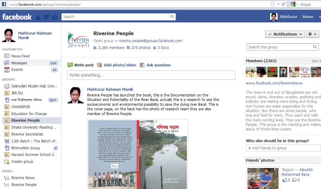 Riverine people's strength is here we all are the university students, who are young and energetic. Primarily we are doing research activities and we have already conducted a research on dying river named Baral and we have submitted it to the government for taking necessary steps to save it, Moreover we have a group in the Facebook, which has 3343 member and also page named 'riverine news' where we update the regular river related news published at the dailies of home and abroad; I am specially doing this as I am secretary of online affairs of riverine people.